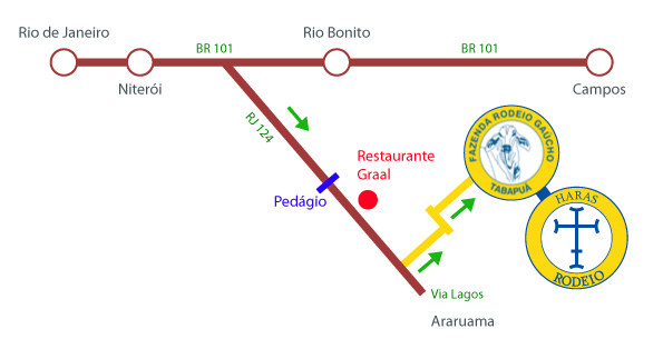 Vindo pela RJ 124, passe pelo pedágio, 1 Km após o posto e ao Restaurante Graal dobre à esquerda, junto a um loteamento.